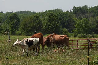 several Longhorn cattle (Bos taurus taurus) & an American Robin (Turdus migratorius)